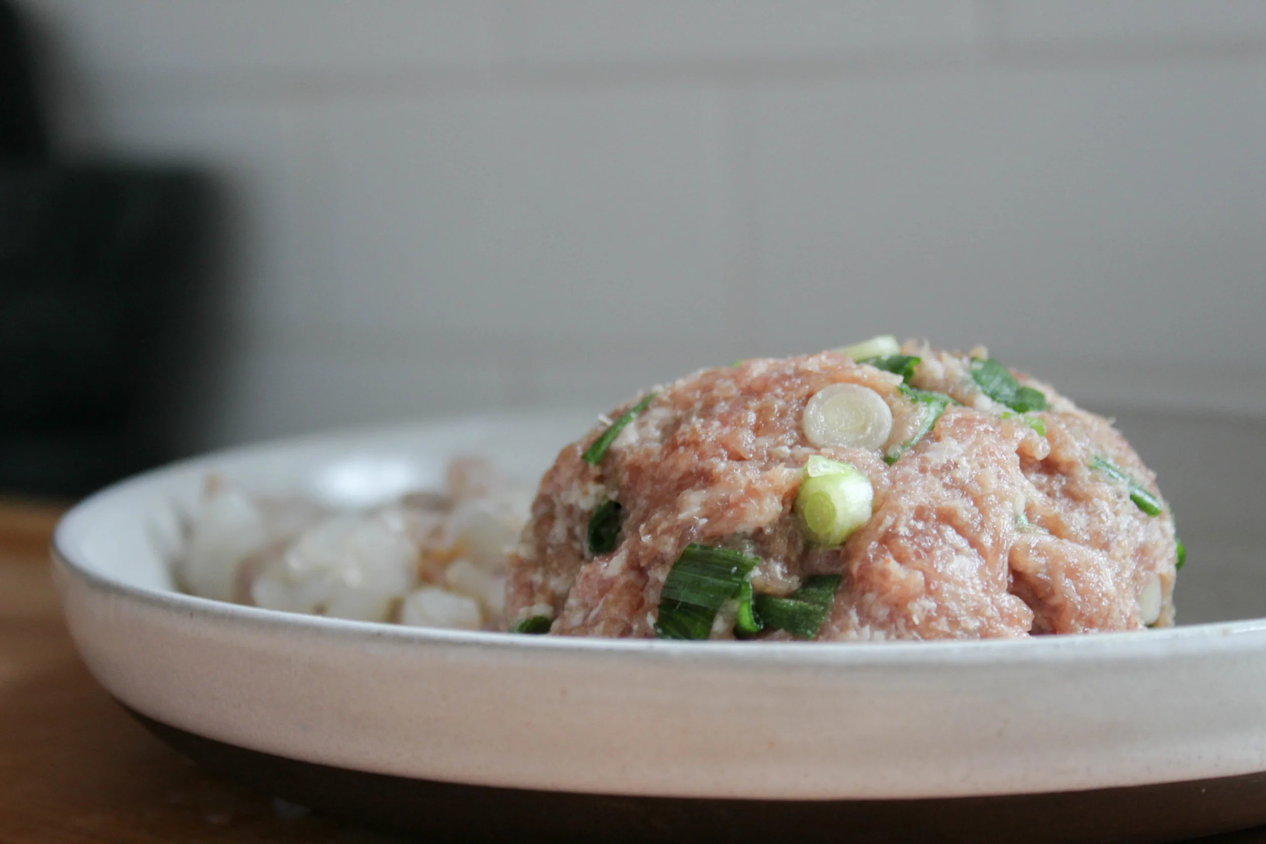 4. Finely chop the scallion. Take the pork out of the fridge and mix in the scallion. Roll that into a large ball and place next to the shrimp.