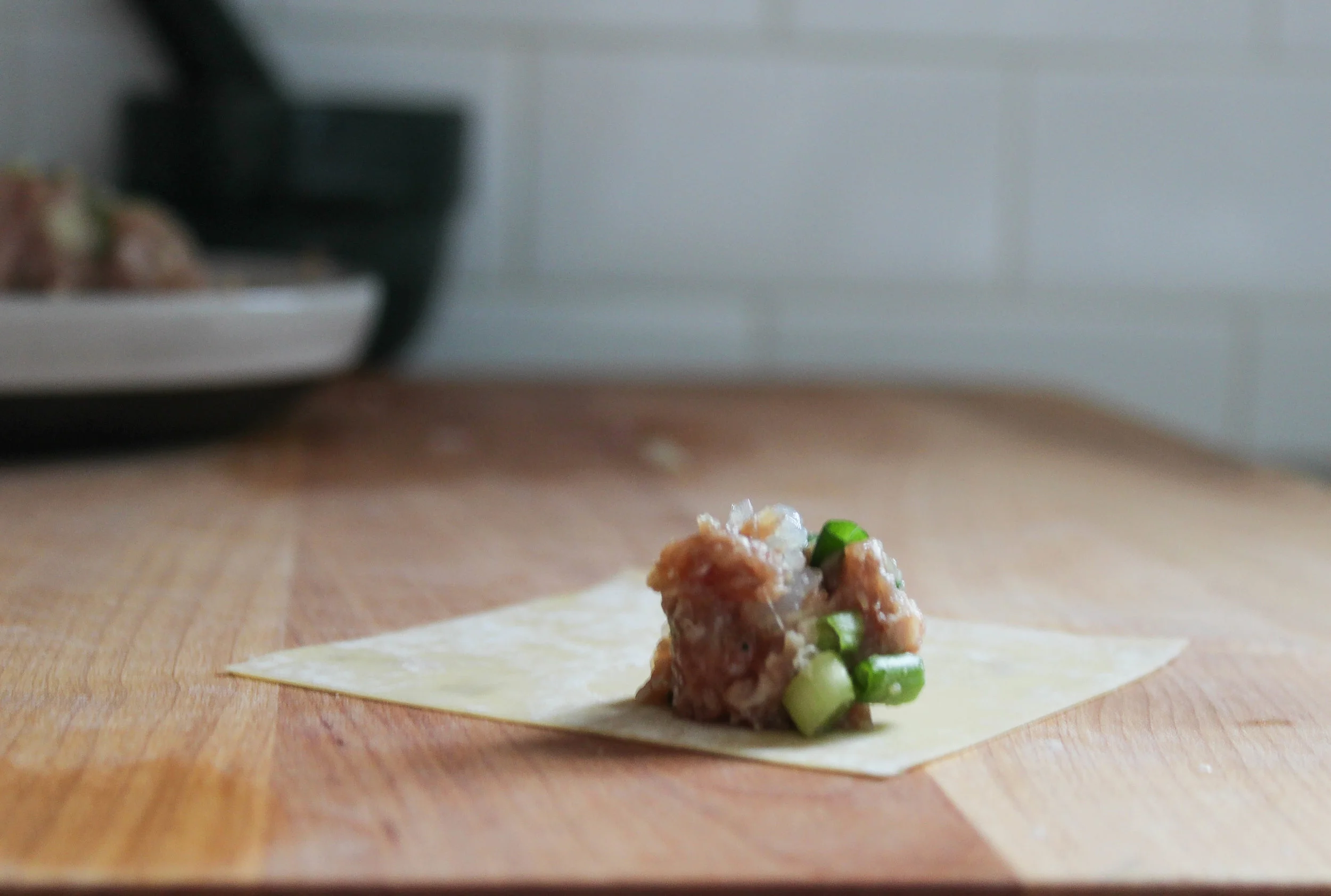 Despite being one of my favorite dishes (growing up, I was borderline obsessed—on a three-week trip to China I ordered only wontons, seriously), I haven't had wontons in years. And it had been even longer since I took a small bit of pork and shrimp filling, rolled it up in a ball, placed it on the wonton wrapper, folded it twice to form a triangle, picked it up, dipped one end of the triangle in egg yolk, and twisted it, forming one perfect wonton. Nine years to be exact.