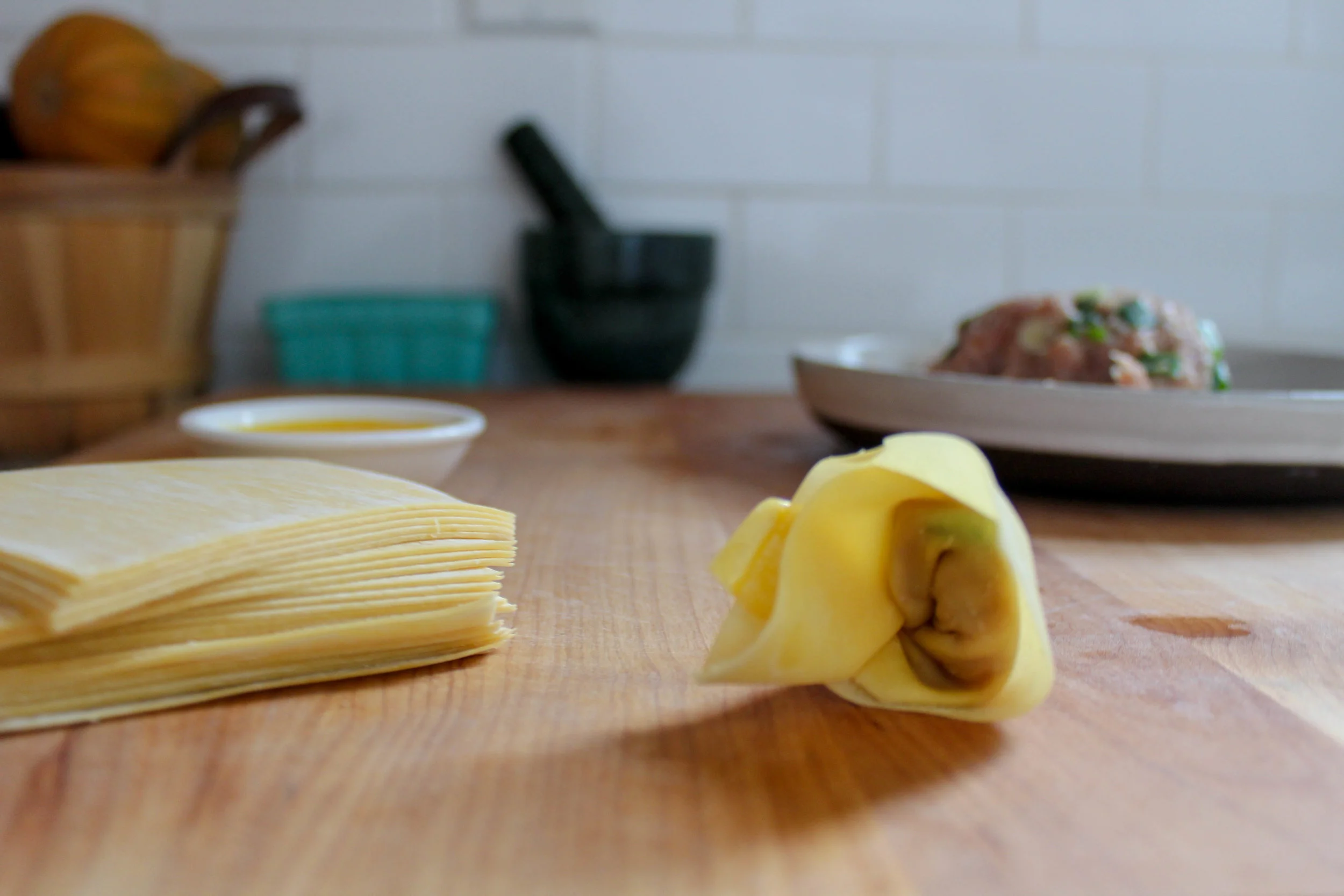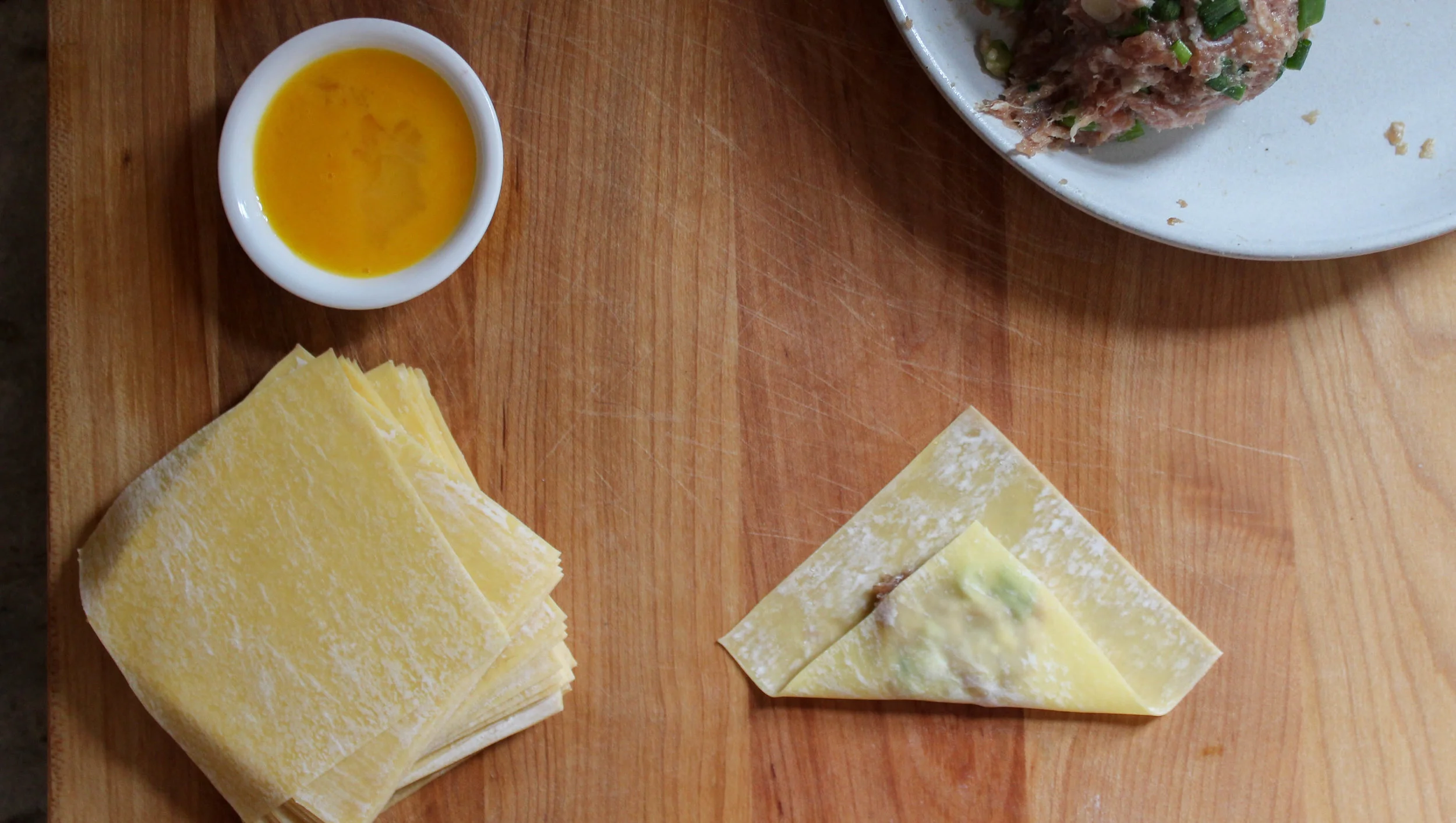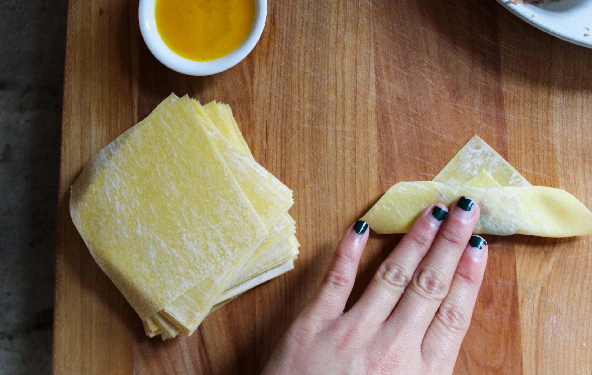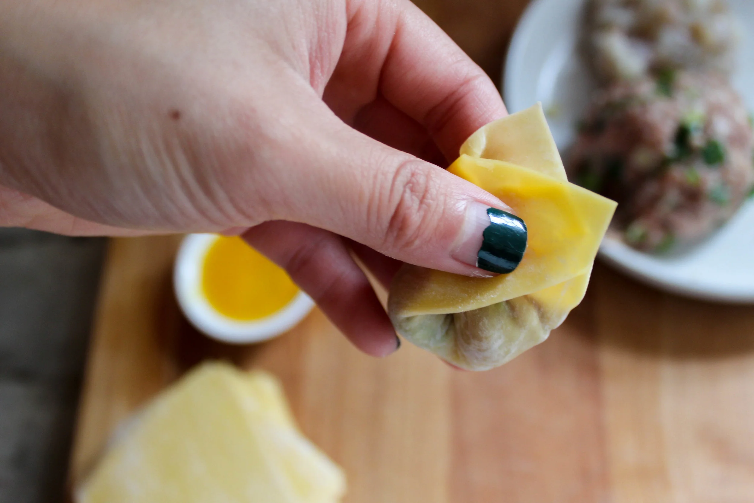 With the filling made and my station prepped, I stood at the counter and stared. The chopping board on my left had a bowl with the filling, next to it lay the wonton wrappers, and next to them sat a bowl of egg yolk. The chopping board on my right sat empty and dusted with flour, ready to receive the finished wontons. I panicked. How do I fold them? I completely forgot.