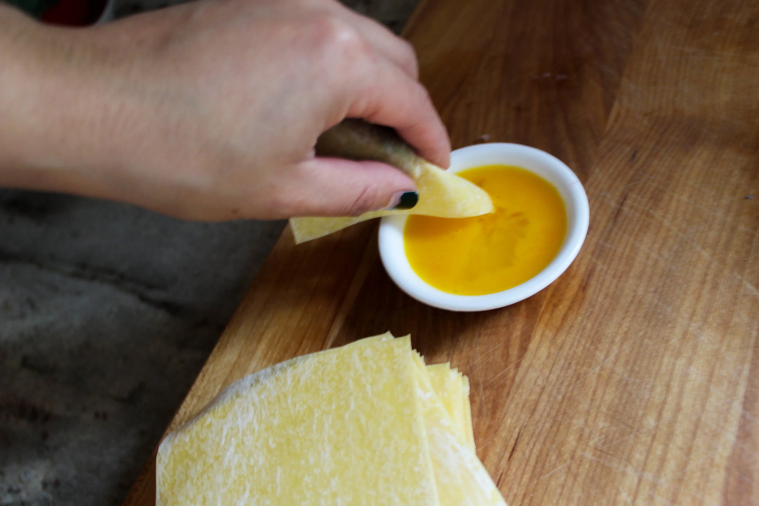 8. Pick up the soon-to-be wonton and dip the back corner of the right side of the triangle into the egg yolk—this will help bind the wonton because egg is a natural glue.