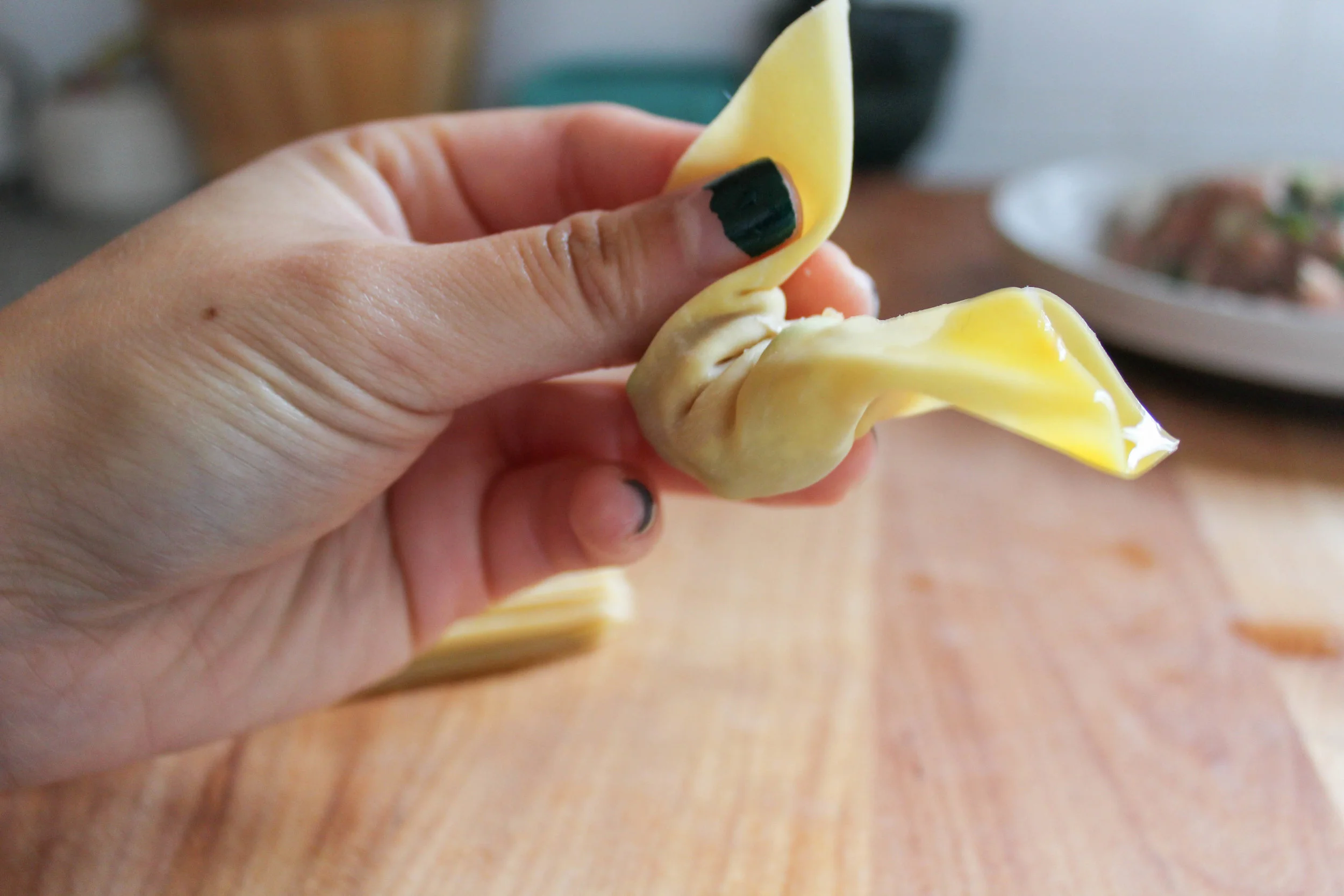 10. Repeat steps 5–9 until you've run out of meat. You'll probably have leftover wonton wrappers, and that's okay. They freeze nicely for the next time you want to make wontons.