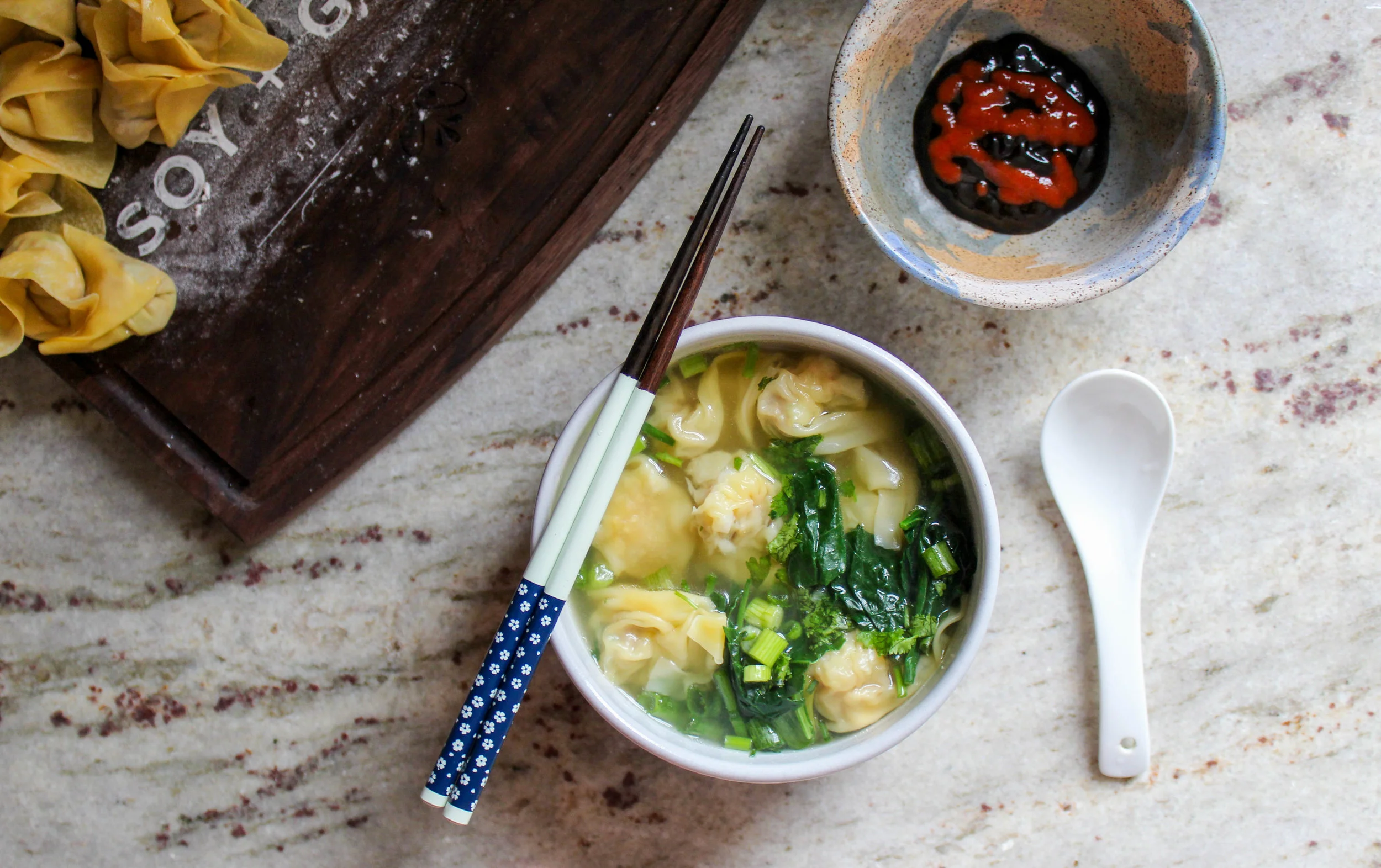 Chopped scallion and cilantro are great finishing herbs for the dish. On the side, I like having a hoisin and chili garlic sauce mixture to top off each wonton. I'll place a wonton on the soup spoon and use my chopsticks to dab the sauce on top of the wonton to create the most magical bite.