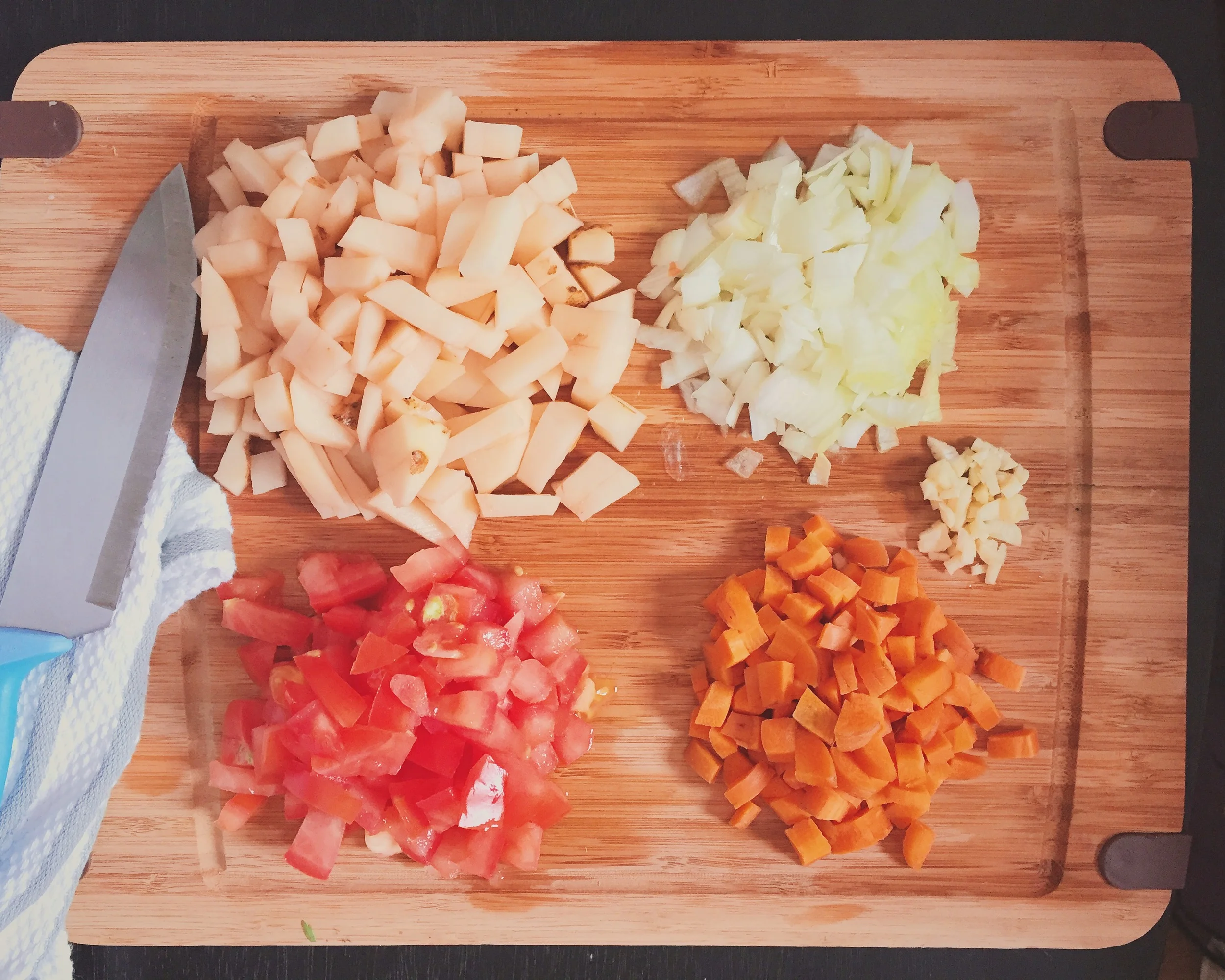 2. When ready to cook, take the marinated beef out of the refrigerator and let it settle to room temperature. Meanwhile, mince the garlic and start dicing the potatoes, tomatoes, onions, and carrots into small pieces so that they are about 1/2 an inch big. "Your dad chops them too large. Make sure it's small, like the size of your thumb nail," explained mom. Welcome to Mom's measurement system, where anything goes.